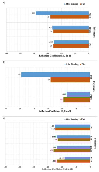 Despite the aforementioned LCP limitations, they are widely used as flexible substrates and have become one of the most desirable organic materials for high-frequency applications as they can withstand rises in operational frequencies and are very suitable for RFID antennas [82,83,84]. A design of series-fed two dipole antennas on the LCP substrate is presented in [81] where the bending effects on the proposed antennas are tested. The results demonstrated that bending has a minor effect on Voltage Standing Wave Ratio (VSWR) but evidenced decreased gain and directivity of the proposed antenna. In [8], a flexible dual-band LCP antenna is presented in [10] where radiation characteristics of the proposed antenna are measured at different bending angles and revealed that reflections are almost the same at bending angle of 60 degrees as compared to the flat condition of the antenna. A circularly polarized (CP) flexible CPW fed antenna is presented on the LCP substrate [85]. The antenna is tested at various bending angles (30°, 60°, 90°, 120°) at 3.5 and 5.8 GHz frequencies with reflection coefficients, at the different angles, showing a good correlation between simulated and measured values with just a slight shift in resonant frequency towards the lower component for bending angles at 60° and 90°. In [85], a CPW fed antenna is fabricated on an LCP substrate for WiMAX(3.5 GHz) and WLAN(5.8 GHz) applications and indicated good agreement of results for various degrees of curvature up to 120 degrees.