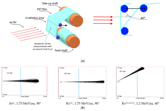 A PET roll film of the Hostaphan® RNK-12 trademark manufactured by Mitsubishi (Hood Rd, Greer, SC, USA) with a nominal thickness of 12 µm and a width of 320 mm was irradiated at the DC-60 heavy ion accelerator in Nur-Sultan, Republic of Kazakhstan. The irradiation layout is shown in Figure 1a. Sections of the 300 × 200 mm film located between two support rolls were irradiated at normal orientation (i.e., the film vertical and ion beam horizontal in our set-up) and experiments repeated with the film tilted so that the ion beam was incident on the film at 40° to the normal, giving an ion path length of (12/cos40) ~16 µm. The irradiation angle was changed by shifting the upper roll relative to the lower one in the direction of the ion beam incidence, as shown by the arrow in Figure 1a. The deviation of the beam angle did not exceed 1° at the edges of the irradiation zone.