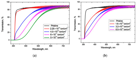 Interference-free transmission curves Tα(λ) of the irradiated PET films obtained from Figure 2 for: (a) Ar8+ ions; and (b) Kr15+ ions.