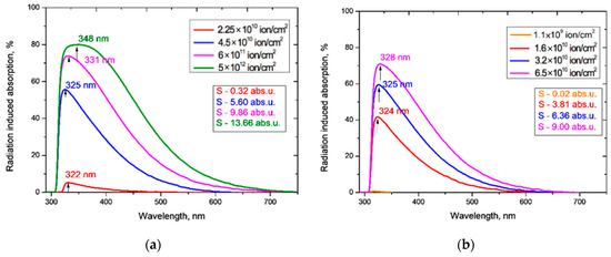 Radiation-induced absorption of the PET films obtained from Figure 4 for: (a) Ar8+ ions; and (b) Kr15+ ions.