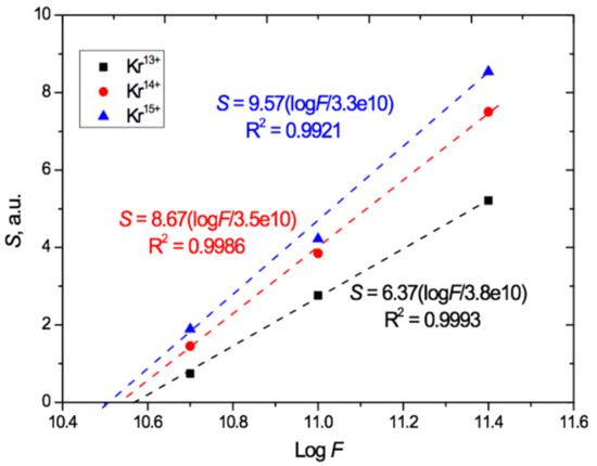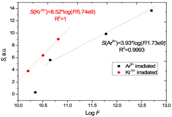The extrapolation of the lines in Figure 6 and Figure 7 beyond the experimental points to intersect with the logF axis provides a very rough first estimate of the lower bound of the range of applicability of this logarithmic relationship, which clearly cannot hold for S < 0. For normal irradiation, this estimated lower bound is about 2 × 109 cm−2 for Ar8+ and 6 × 109 cm−2 for Kr15+ ions, and for angled irradiation with Kr13+14+15+ ions, the estimated lower bound on applicability is in the range (3–4) × 1010 cm−2.