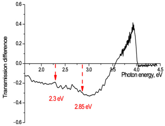 Electret studies commonly make use of thermally stimulated discharge (annealing) to investigate the release of charges from traps in pre-charged electret films [54]. Thermal stimulation causes metastable states to move towards their state of thermodynamic equilibrium. In our experimental situation it should provide information on where slow electrons have been trapped after ion irradiation and where they move to when de-trapped by heating. A sample of PET film, irradiated at an angle of 40° with Kr13+ ions of energy 1.2 MeV/au and fluence of 5 × 1010 cm−2, was annealed for 160 h at a temperature below the glass transition temperature and with no access to air and light, to stimulate thermal discharge of charges from traps. The UV-vis transmission spectrum after annealing was compared with that from before, and the difference spectrum for this sample is shown in Figure 9.
