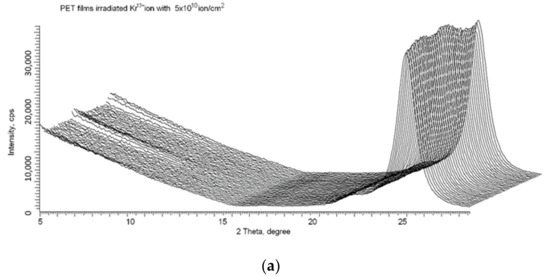Studies of structural changes in the irradiated PET films were performed by X-ray diffraction in the Bragg-Brentano geometry in the angular range of 2θ = 5 − 30° and azimuthal sweep φ = 0 – 2 π in increments of 10° using the D8 Advance Eco Bruker X-ray diffractometer (Bruker, Karlsruhe, Germany).