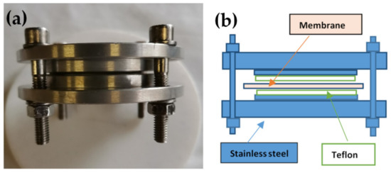 (a) Photo and (b) schematic representation of the device used for the preparation of Nafion 117 oriented.