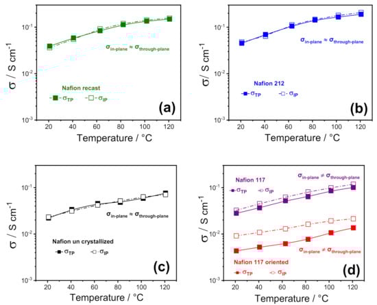 In-plane vs. through-plane proton conductivities of (a) Nafion recast, (b) Nafion 212; (c) Nafion un crystallized and (d) Nafion 117 as received and Nafion 117 oriented membranes as a function of temperature (20–120 °C) at 90% RH%. (The error bars are not reported because they are smaller than the size of the symbols).
