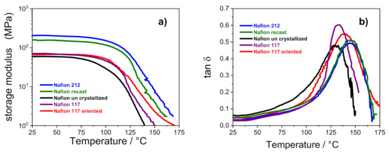 Storage modulus (a) and tan δ (b) versus temperature of PFSA membranes.