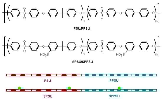 Chemical structure and schematic representation of polysulfone/polyphenylsulfone (PSU/PPSU) and sulfonated polysulfone / polyphenylsulfone (SPSU/SPPSU) copolymers. Sulfonic groups are represented by green circles.