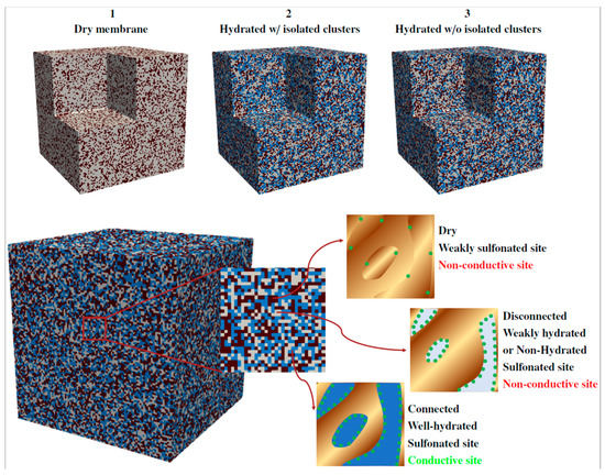 The ionic conductivity of the copolymer membranes was modeled using percolation theory [51]. The numerical model was implemented in the finite volume-based code ANSYS Fluent [52,53,54,55]. According to the random heterogeneous structure of the membranes observed in the FE-SEM images (see Figure 2), the structure of the membranes was divided into three types of sites in a random cubic network: (1) well-hydrated sulfonated sites, (2) weakly hydrated or non-hydrated sulfonated sites (i.e., disconnected from the water network), and (3) dry weakly sulfonated sites. Since only sites of type 1 contribute to proton conduction, sites of type 2 and 3 were not taken into account in the simulations. The mesh incorporated one computational cell per percolation site. In the mesoscopic representation of the membranes, each site is internally composed of a random copolymer distribution, either partially filled or not filled of water. Figure 3 shows an example of a virtually generated random structure, indicating the three steps followed for the creation of the cubic networks. Additional structures corresponding to the SPES membranes at different hydration levels can be found in Appendix A (Figure A1). The main steps considered in the implementation of the model are described below.
