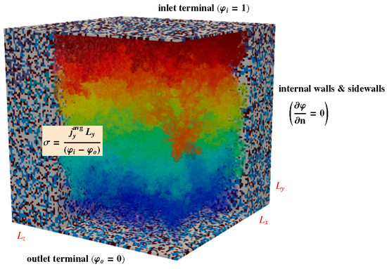 Schematic of the computational domain, showing the generated mesoscopic membrane structure and the computed ionic potential distribution, across the hydrated, conductive network. The boundary conditions, the dimensions of the domain, and the expression used to calculate the global ionic conductivity of the network, , are indicated. Blue sites correspond to hydrated sulfonated sites, gray sites to weakly hydrated or non-hydrated sulfonated sites, and brown sites to dry weakly sulfonated sites.
