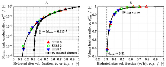 For a given , the normalized ionic conductivity, , can be obtained from Equation (18), while the corresponding value of can be obtained from Equation (21). The resulting fitting curve is added to Figure 5A, showing good agreement with the computed results of the network without isolated clusters (colored symbols). As expected, when , tends to the results of the network with isolated clusters, since both networks are virtually the same. However, when , the results deviate from each other. The percolation threshold is reached for lower values in the network without isolated clusters due to the reduction of the volume fraction of hydrated sites compared to the network with isolated clusters.