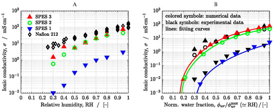 (A) Measured ionic conductivity as a function of relative humidity, RH, at of the SPES membranes. The data corresponding to Nafion 212 are also included for comparison purposes [20,69,70,71]. (B) Computed global ionic conductivity of the membranes (colored symbols) as a function of the ratio . The experimental data (black symbols) are included for comparison purposes.