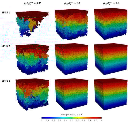 The ionic potential distributions of the three SPES membranes corresponding to various relative volume fractions of hydrated sites () are shown in Figure 7. As can be seen, the conductive networks of SPES 2 and SPES 3 are rather similar in the full RH range, in agreement with the results presented before in Figure 6. In contrast, the hydrated, conductive networks of SPES 1 are significantly more disconnected. For instance, when the ionic network of SPES 1 approaches the percolation threshold, so that only a few pathways connect both extremes of the membrane. As a result, proton transport is strongly hindered, and the ionic conductivity decreases dramatically.