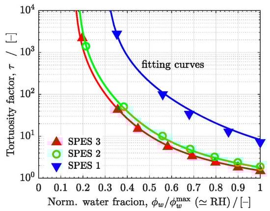 The computed tortuosity factors of the three SPES membranes are shown in Figure 8 as a function of , together with the fitting curves obtained using Equations (22) and (25). For the three SPES membranes, the tortuosity factor grows as the hydration of the membranes decreases, increasing sharply when RH is close to the percolation threshold. The tortuosity factors of SPES 1 are around one order of magnitude higher than those of SPES 2 and SPES 3 (). Therefore, since is similar for the three membranes (), the remaining difference in the conductivity of the membranes arises from the reduction of the intrinsic bulk conductivity (); see Equation (23). Both (i.e., tortuosity) and (i.e., ionic concentration and mobility) play an important role on the global conductivity, . Here, it is worth noting the multiscale nature of proton conduction in PEMs, since the tortuosity and size of ionic channels within each hydrated site affects in turn the value of through the (local effective) proton diffusivity, . As shown in previous works, the membrane processing conditions significantly affect the multiscale morphology of block copolymer membranes [75,76,77,78,79,80]. For instance, Assumma et al. [75] reported a ten-fold increase in proton conductivity after thermal annealing of SPAS multiblock copolymer membranes. This was ascribed to a beneficial impact of annealing on (i) the co-continuous nanophase separated morphology, (ii) the local arrangement of neighboring side chains and/or improved connectivity of ionic channels, and (iii) favorable organization of conductive domains at higher scales.