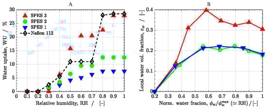 (A) Measured water uptake, , as a function of relative humidity, RH, at of the SPES membranes. The results for Nafion 112 are also included. (B) Predicted local water volume fraction, , as a function of the ratio ( ).