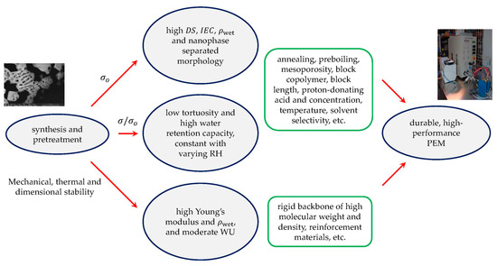 In order to achieve good performance at low RH, it is also necessary to have low tortuosity values (ideally, at any length scale and RH), such that only decreases linearly with the volume fraction of water [75]. This linear decrease can be in turn mitigated by designing PEMs with a high water retention capacity (i.e., a constant volume fraction of water, ideally , with varying RH). For instance, previous works showed a superior conductivity of Nafion membranes by incorporating mesopores into the (porous) polymer structure [82,83,84]. The benefit of this practice could be related to an increase of the interfacial surface of the membrane exposed to the humidified environment (i.e., an increase of the number of “points of water sorption”) and to a better interconnectivity of ionic channels introduced by water-filled mesopores. Moreover, an increase of the ionic concentration with decreasing RH may serve to counterbalance the reduction of the ionic conductivity caused by a lower water content. For this, it would be necessary to synthesize membranes with densities notably higher than that of water (e.g., Nafion has twice the density of water).