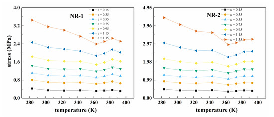 Stress–temperature curves at different constant strains for NR-1 and NR-2 (ε is the value of the nominal strain).