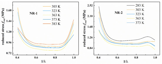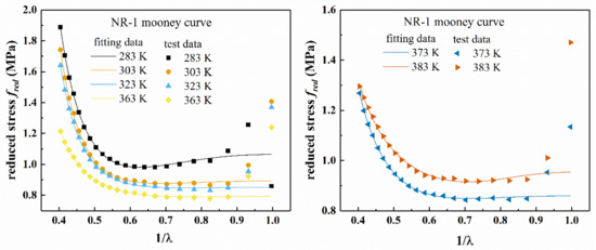 According to Figure 3, temperature has significant effect on the reduced stress of filled rubber. From Figure 3, as the temperature increases, the initial modulus of the rubber first decreases, and then increases after the temperature reaches 363 K. The absolute value of the slope and the reduced stress of the Mooney plot increased with the increase of the tensile ratio at larger stretches(), which suggested that the deviation from Gaussian behavior was due to the interactions or constraints of neighboring chains. In addition, the “up-turn” indicated the non-Gaussian regime of chain stretch. The Mooney plot of NR-1 showed an overall upward trend at , and the reduced stress gradually decreased with the increase of the tensile ratio , which supported the Mooney–Rivlin model [2]. However, NR-2 showed a downward trend at . At , the Mooney plot showed a straight line with a slope of zero, which indicated that the material obeyed Gaussian statistics.