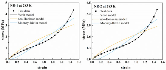 Figure 4 shows the fitting results of several polynomial models for the uniaxial stretching of rubber materials NR-1 and NR-2 at 283 K in a larger deformation range (nominal strain ε < 1.5). Figure 5 shows the fitting results of Ogden model for uniaxial tension. It can be seen from Figure 4 that the neo-Hookean model and Mooney–Rivlin model cannot fit the “S-shape” characteristics of the stress–strain curve under larger deformation, and there are obvious deviations between the fitting results and the uniaxial tensile test data. Therefore, the neo-Hookean model and Mooney–Rivlin model cannot accurately characterize the nonlinear change of material stiffness under larger deformation. The Yeoh model has better fitting results.