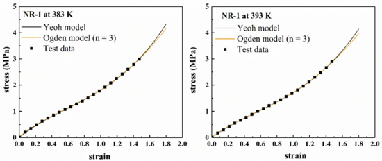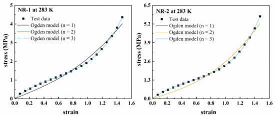 It can be found from Figure 5 that for the experimental data of NR-1 at 283 K, when n = 1, the Ogden model has poor fitting results. When n = 2 and n = 3, the fitting curves overlap, and the model is in good agreement with the experimental data. For NR-2 at 283 K, when n = 1 and n = 2, the fitting curves of Ogden model overlap. Only when n = 3, the fitting curve can well describe the experimental data. The results show that when n = 2, the ability of the model to describe experimental data was unstable.
