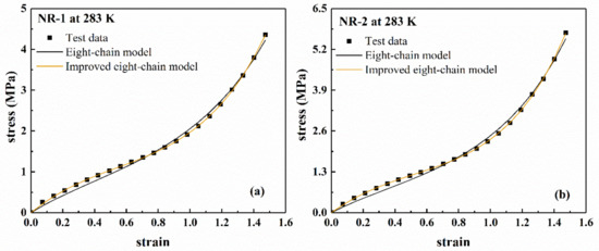 Figure 6 shows the fitting results of the eight-chain model and the improved eight-chain model. The residuals of the fitting results are shown in Figure 7. The values of of both models are listed in Table 2. From Table 2, it can be seen that the improved eight-chain model provides a better fit for both types of rubber than the eight-chain model. From Figure 6 and Figure 7, it can be seen that although the eight-chain model can reflect the main characteristics of the mechanical behavior of the rubber to a certain extent, there is still a significant deviation between the fitting results and the experimental data. In the entire deformation range, the fitting result of the improved eight-chain model is better than that of the eight-chain model. In summary, the improved eight-chain model has a better fitting effect.