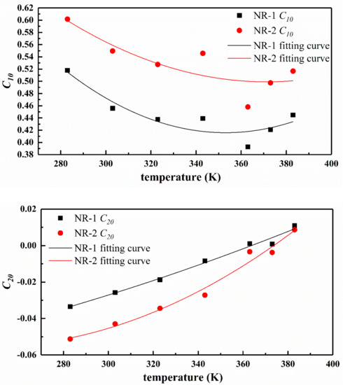 The fitting parameters of Yeoh model for NR-1 and NR-2 experimental data at different temperatures are listed in Table 3. The following relationship was obtained by fitting the experimental data.