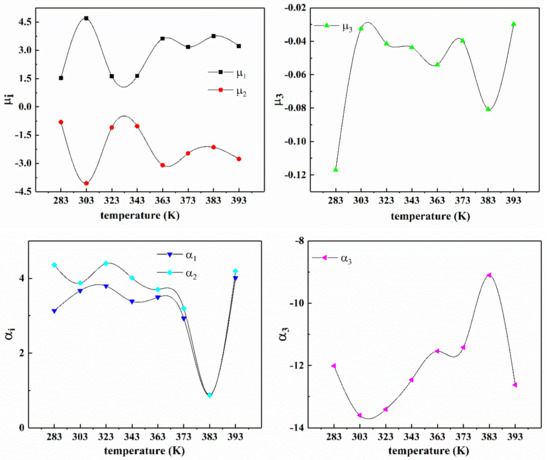 Figure 9 shows the relationship of Yeoh model parameters with temperature and the fitting curve of parameters according to Equation (15). As shown in Figure 9, the trend of Yeoh model parameter with temperature is similar to the stress-temperature curve, that is, as the temperature increases, the parameter value first decreases and then increases, and the inflection point is between 353 K and 373 K. In conclusion, varies approximately as a quadratic function with temperature, and has a certain temperature dependence. The parameters and almost change linearly with temperature. Figure 10 and Table 4 show the relationship between the parameters of Ogden model (n = 3) and temperature. As can be seen from the diagram, the parameters of Ogden model have no law with the change of temperature, so it can be said that the parameters have no temperature dependence.