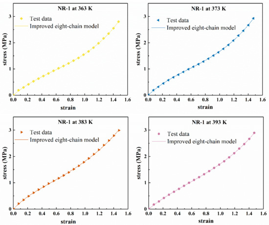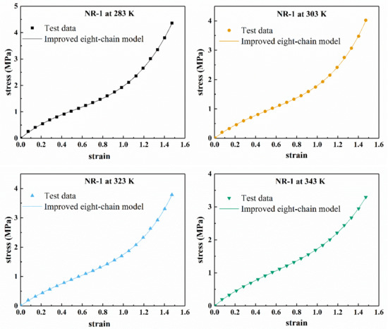 Fitting results of NR-1 under uniaxial tension at different temperatures by improved eight-chain model.