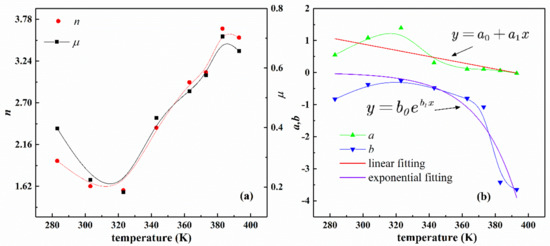 Temperature-dependent curves of fitting parameters of NR-1 under uniaxial tension at different temperatures by improved eight-chain model. (a) Curves of parameters , with temperature; (b) Curves of parameters , with temperature and the corresponding fitting curves.