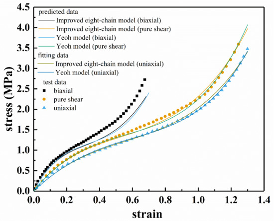 If only uniaxial tension data is used, a set of coefficients can be obtained through each constitutive model. After the coefficients are determined, the constitutive model can predict biaxial tension and pure shear curves. According to the conclusions of the previous section, the Yeoh model and the improved eight-chain model were selected to evaluate the predictive ability of the experimental data.