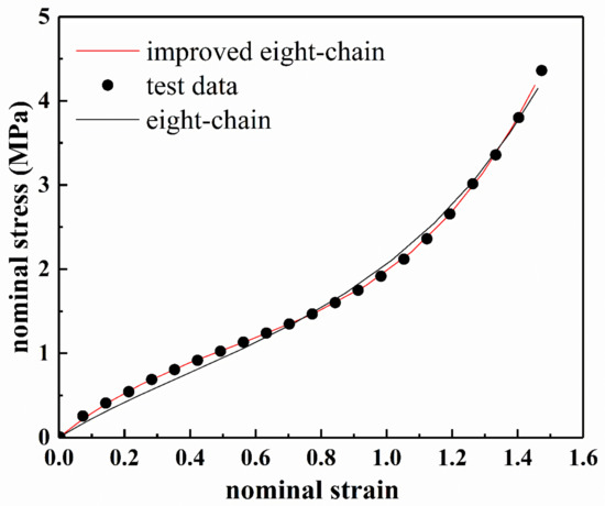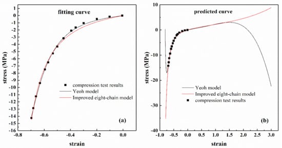 Figure 15a shows the stress–strain curve on the Przybylo and Arruda compression test results [37], and the Yeoh and improved eight-chain models were used to fit the experimental data. The fitting results are also shown in Figure 15a. The corresponding fitting coefficients and correlation coefficients R are listed in Table 7. From Figure 15a and Table 7, it can be found that both models can accurately reproduce the uniaxial compression data. When the uniaxial compression analysis of each model was extended beyond the characteristic range, the Yeoh model failed to predict the expected response, as shown in Figure 15b, which was due to the fact that as the compressive stretch increased, the nominal stress had a smaller and smaller negative value. The constants in Table 7 were used to predict uniaxial stretching, and the results are shown in Figure 15b. The predicted tensile results were similar under moderate stretches (ε < 1.5) for both models, but varied substantially under large stretches (ε > 1.5), only the improved eight-chain model can reasonably predict the actual physical response of tension, the Yeoh model become unstable in tension and predict unrealistic responses. This result was due to the fact that the Drucker’s stability of the Yeoh model was not considered [38]. However, considering the stability will sacrifice the fitting accuracy of the model. The improved eight-chain model is extended from the eight-chain model, so the parameters have inherent stability. Therefore, from this perspective, the improved eight-chain model is superior to the Yeoh model.