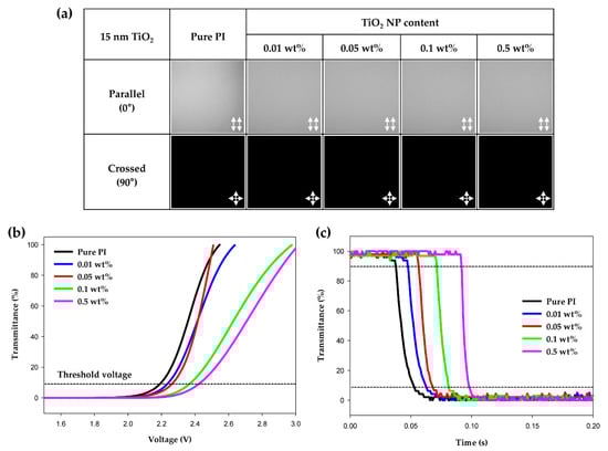 - Wu, P.; Yang, S.; Lee, W. Recovery of UV-degraded electrical properties of nematic liquid crystals doped with TiO2 nanoparticles. J. Mol. Liq. 2016, 218, 150–155. [Google Scholar] [CrossRef]