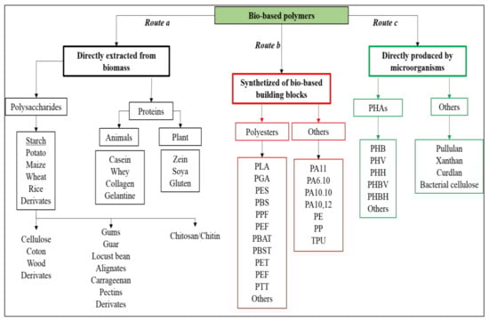 Bio-based polymers classification: (a) directly extracted from biomass, (b) obtained through polymerization of bio-based building blocks, and (c) directly produced by microorganisms. PLA = poly(lactic acid); PGA = poly(glycolic acid); PES = poly(sulfone)s; PBS = poly(butylene succinate); PPF = poly(propylene 2,5-furandicarboxylate); PEF = poly(ethylene 2,5-furandicarboxylate); PBAT = poly(butylene adipate-co-terephthalate); PBST = poly(butylene succinate-co-terephthalate); PET = poly(ethylene terephthalate); PTT = Poly(trimethylene terephthalate); PA11 = polyamide 11; PA6.10 = polyamide 6.10; PA10.10 = polyamide 10.10; PA10.12 = polyamide 10.12; PE = polyethylene; PP = polypropylene; TPU = thermoplastic polyurethane; PHB = poly(3-hydroxybutyrate); PHV = poly(3-hydroxyvalerate); PHH = poly(3-hydroxyhexanoate); PHBV = poly(3-hydroxybutyrate-co-3-hydroxyvalerate); PHBH = poly(3-hydroxybutyrate-co-3-hydroxyhexanoate).