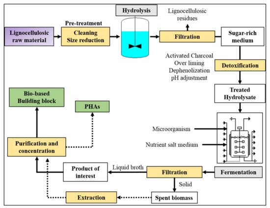 Schematic diagram for the obtainment of bio-based building blocks and poly(hydroxyalkanoates) (PHAs) using lignocellulosic raw materials.