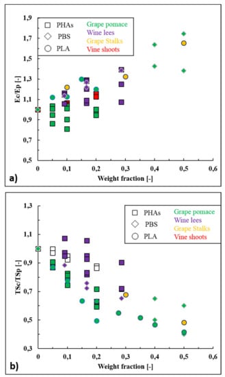 (a) Ratios (EC/EP) between Young’s modulus of wine-based composites (EC) and neat biopolymers (EP), and (b) ratios (TSC/TSP) between tensile strength of wine-based composites (TSC) and neat biopolymer (TSP) as function of the wine filler content.