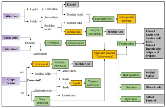 Therefore, the aim of this review is to show the potential uses of wine by-products as feedstocks for the production of bio-based building blocks or biopolymers directly synthetized by microorganisms (e.g., poly(hydroxyalkanoates) (PHAs)) and for the fabrication of cost-effective reinforcing fillers. In each case, this review particularly focuses on the principal biopolymers both bio-based (fully or partially) and biodegradable, and present in large-scale, which are namely poly(lactic acid) (PLA), poly(butylene succinate) (PBS), and poly(hydroxyl butyrate) (PHB). The results presented in the literature have been reported and discussed, and a possible route of valorization of wine by-products within the polymer sector has been proposed. Despite the recent publication of the Handbook of Grape Processing By-Products, edited by C.Galanakis in 2017 [19], and despite the presence in literature of other reviews dealing with the new trends of valorization of wine waste [20,21,22,23,24], there are no reviews fully focused on the potentialities of wine by-products as raw materials for the plastic industry.