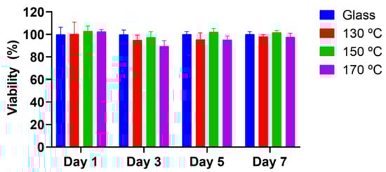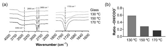 All these results combined confirm the presence of PGS cured under the three curing temperatures (130 °C, 150 °C and 170 °C) using the spin-coating technique. When higher curing temperatures are applied, the reactivity of PGS oligomers and macromers increases, yielding a more crosslinked elastomer, as exposed in Figure 1b. These results are in accordance with literature for non-spin-coated PGS films [,].