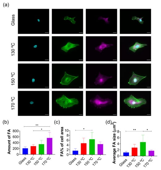 Subsequently, to investigate the role of different PGS’s curing temperatures in HUVECs early adhesion and FA formation, immunofluorescence quantification was performed. From Figure 3a it can be stated that HUVECs FA expression is mostly revealed in the cytoskeleton periphery and nucleus. The number of FAs increases gradually with curing temperature (Figure 3b). A temperature-dependent trend is also observed in the FA percentage of cell area (cytoskeleton surface) (c) and (d) the relative area of FA compared to the total cell area, using actin quantification. However, 150 °C is the temperature yielding the most remarkable results in this respect, PGS 170 °C performing as PGS 130 °C in terms of FA area, and worse than it is for FA size.