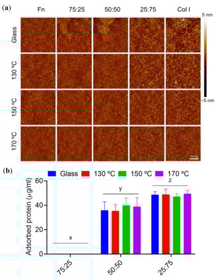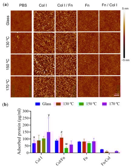 AFM images from sequential experiments highlighted the non-interchangeable role of the order of protein deposition. On the one hand, when Fn is the first incubated protein, Col I is not able to form its typical fibrillar structures that are formed when Col I is adsorbed in a single step. This is because the Col I-Col I interactions shift to Col I-Fn ones, with Fn already adsorbed onto the surface, as found in [] where it was studied how Fn binds to Col I via its collagen-binding domain. Since Col I protein concentrations are lesser in the Fn/Col I sequential condition, together with its interaction with Fn, an impairment of its Col I-Col I fibrillar network appears subsequently. This behaviour is alike no matter the temperature set to cure the PGS substrates (Figure 4a, column Fn/Col I). In line with the above, Figure 4b shows that proteins adsorbed in the Fn/Col I experiment are negligible when compared with the rest of the protein coating scenarios.
