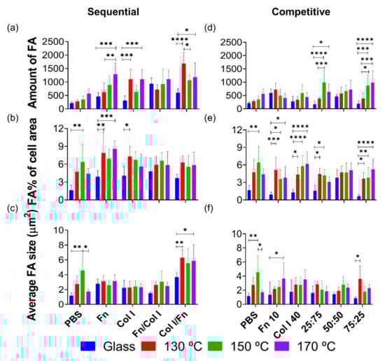 To investigate the role of PGS-proteins-HUVECs early adhesion and the material’s chemistry effect on FA formation, immunofluorescence quantification was studied, as exposed in Figure 6. All PGS conditions lead to better FA results if compared with glass. Particularly, when Fn is incubated onto the PGS samples, FA related parameters increase with PGS curing temperature since Fn enhances integrins receptors directly related with FA []. Thus, the results obtained under Fn/Col I protein incubation can be justified by the Fn-Col I binding effect, which avoids Col I-Col I linkage and blocks its fibrillar structure formation.