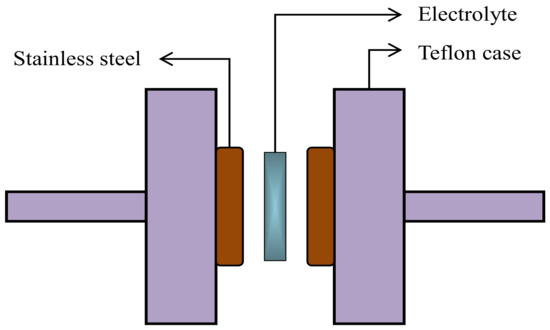 Electrochemical properties of the SPEs were initially investigated by TNM using a V&A Instrument (DP3003) (V&A Instrument, Shanghai, China) connected with a digital DC power supply. The circuit diagram for the TNM measurement was shown in our previous work, as reported in Reference [38]. This method was used to determine the ionic transference number (tion) and the electronic transference number (te). A working voltage of 0.20 V was applied at ambient temperature. Moreover, it is also important to identify the electrochemical stability and breakdown voltage of an electrolyte. For this purpose, LSV was conducted using a potentiostat (DY2300) (Neware, Shenzhen, China) with a scan rate of 10 mV/s. Figure 1 shows the schematic illustration of the electrodes and electrolyte arrangement for the LSV analysis, where only the highest conducting electrolyte was utilized. Stainless-steel was used as a reference, working, and counter (auxiliary) electrodes.