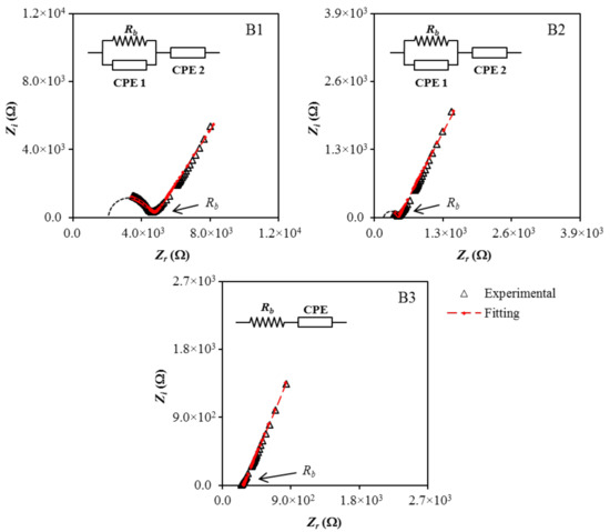 Cole–Cole plots of (B1, B2, and B3) at (stainless-steel electrodes) are shown together with the fitted curves in Figure 2. In each case, the electrical impedance spectroscopy (EIS) data were fitted to an equivalent circuit consisting of two capacitors arising from the constant phase element (CPE) of the immobile polymer chains, and a resistor is the bulk resistance (Rb) of the system, as presented in the inset of Figure 2 [39]. For the B1 and B2 electrolytes, the parallel arrangement of Rb and CPE1 yielded a semicircular arc observed in both Cole–Cole plots signify the charge conductivity within the electrolytes. The spike/tail at the low frequency region in the EIS plots represents the charge accumulation during the polarization process, due to the diffusion mechanism of the system [40,41].