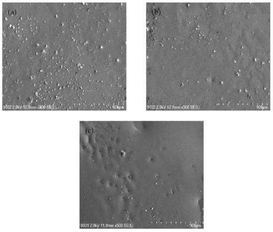 Field emission scanning electron micrographs were obtained at a 500× magnification for each system to support the EIS results, and the micrograph for each system is shown in Figure 3a–c. The white structures represent the protruding salts within the surface of the samples in Figure 3a–c. When there is the inclusion of 14 and 28 wt.% glycerol into the electrolyte system, few salts appeared within the films’ surface, as discovered in Figure 3a,b. The glycerol decreases the electrostatic force among cations and anions of the salt, and thus, will produce more mobile ions [48]. The existence of a plasticizer can improve the amorphous structure of the electrolyte and improve the conductivity [49]. Thus, the high concentration of glycerol can dissociate more salts into caions and anions. As it can be observed from the field emission scanning electron micrograph in Figure 3c that protruding salt structures are not evidently visible as the glycerol concentration was increased to 42 wt.% (B3 system) in comparison to the B1 and B2 electrolyte systems. The highest plasticized sample has smooth and uniform surface morphology without any phase separation. In our previous work [50], obvious phase separation in CS:PEO blend electrolyte has been detected. The lack of phase separation in Figure 3 is a confirmation for the complete blending of CS with dextran. The field emission scanning electron micrographs are in good agreement with the results of EIS. The white structures decreased in the B3 system, and the Rb value diminished, as seen in the EIS plot, while conductivity increased. It is documented that the smooth morphology appearance is related to the amorphous nature development of the electrolyte systems [51]. In the previous work [50], the combined results of EIS and morphological appearance were used to understand the structure-property relationship. The smooth surface electrolytes can aid conducting ions to transfer easily, and hence, improve the DC ionic conductivity [51].