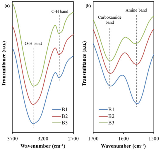 FTIR spectra at (a) 2700–3700 cm−1 and (b) 1500–1700 cm−1 band regions.