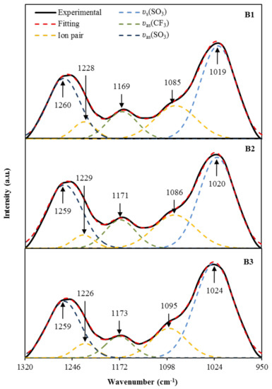 On the other hand, the region of 950–1320 cm−1 is known to include a few important functional groups, such as asymmetric vibration (υas) and symmetric vibration (υs), associated with the trifalte anion (CF3SO3)− of NaTf salt [60,61]. According to Jeya et al. [60], the two bands at 1259 cm−1 and 1027 cm−1 are attributable to free ions υas(SO3) and υs(SO3). The authors also mentioned that the free ions’ peak will split into two, one at a lower and another at a higher wavenumber. This region is also used to determine the transport parameters; number density (n), ionic mobility (µ), and diffusion coefficient (D) based on the percentage of free ions, and it is highly correlated to the conductivity of the electrolytes [62]. The deconvoluted FTIR spectra for the region of 950–1320 cm−1 are shown in Figure 5. For B1 electrolyte, the free ions’ peak are identified at 1260 cm−1 and 1019 cm−1, while the ion pairs peak are identified at 1228 cm−1 and 1085 cm−1. For B2 electrolyte, the free ions’ peak are observed at 1259 cm−1 and 1020 cm−1; whereas, the ion pairs peak are identified at 1229 cm−1 and 1086 cm−1. For B3 electrolyte, the free ions’ peak are determined at 1259 cm−1 and 1024 cm−1, while the ion pairs peak are observed at 1226 cm−1 and 1095 cm−1. As the intensity of these free ions peaks is increased, the formation of ion pairs will occur. Besides, the υas(CF3) band obtained by the electrolytes in this work, which is at 1169–1173 cm−1 is similar to 1165–1173 cm−1 reported by Ranjana et al. for the Polyvinylidenefluoride-co-hexafluoropropylene: Polymethylmethacrylate:NaTf electrolyte system [61]. The percentage of free ions can be determined using the following relation.