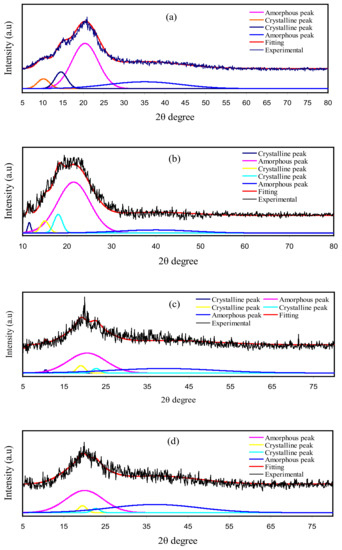 XRD for pure CS, CS: dextran, and CS: dextran: NaTf: glycerol at room temperature are shown in Figure 6. The CS has crystalline peaks at the 2θ values of 10.1°, 15.1°, and 20.9° [65,66] (Figure 6a), while dextran possesses two hallows at 2θ values of 18° and 23°, as indicated in the previous work [67]. In the current work, two hallows and smaller crystalline peaks were observed in the XRD pattern of CS: dextran (Figure 6b). It is interesting that (as shown by the broad hallows) CS: dextran is not as crystalline as pure CS and its structure is almost amorphous [68,69]. Based on earlier studies, the amorphous nature of polymer electrolyte is related to broad diffraction peaks [70,71]. To determine the crystallinity degree, it is vital to deconvolute the XRD pattern for each film to find the areas of the crystalline and amorphous peaks [71]. The degree of crystallinity (Xc) was determined using Equation (11), and shown in Table 6 [72]: