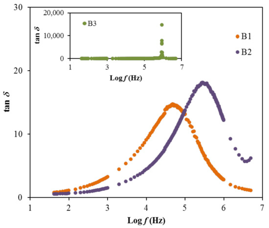 Furthermore, the frequency dependence of dielectric loss tangent (tan δ) can be determined for the electrolytes to further understand the relaxation processes of the electrolytes. As mentioned above, the Zr and Zi data have been obtained from the EIS data and then used to find the ε’ and ε” data. The dielectric parameters are used to determine the tan δ. The tan δ is a ratio of energy disperse to energy stored in a periodical field, which is also known as the dissipation factor [78]. The tan δ is determined using the relation below [78].