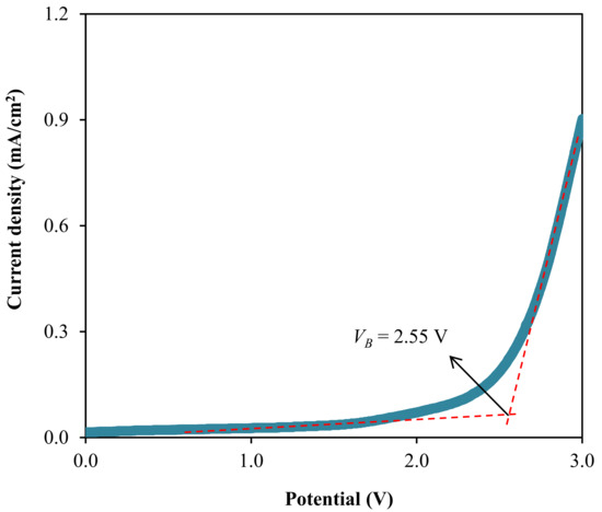 where D+ and D− represent the diffusion coefficient of cation and anion; while µ+ and µ− are the ionic mobility of cation and anion, respectively. The calculation is based on the transport parameters listed in Table 5. From Equation (19), , can be calculated and by using Equation (20), , D− can be obtained. The calculated values of D+ and D− for the B3 electrolyte are found to be 9.50 × 10−11 and 1.15 × 10−12 cm2 s−1, respectively. Similarly, using Equations (21) and (22), and were founded to be 3.70 × 10−9 and 4.49 × 10−11 cm2 V−1 s−1, respectively. From these results, it can be concluded that the cationic values are more significant than those of anionic for both D and µ. Therefore, in polymer electrolytes, researchers have mainly focused on cations rather than anions. The ionic conductivity is found to be reliant on these two parameters (D and µ) [6]. Hafiza et al. [102] also reported a similar observation for the influence of ions on D and µ values. The diffusion coefficient values achieved in this work is analogous to the earlier studies where the diffusion coefficient is in the range from 10−13 to 10−8 [96,103,104,105]. Furthermore, another vital characteristic of an electrolyte is the maximum working voltage. This measurement is significant to identify the breakdown voltage (VB) of an electrolyte that can withstand that can be acquired from the LSV analysis [106]. The LSV curve for the highest conducting electrolyte, B3 (at room temperature), is presented in Figure 12 at a scan rate of 10 mV/s.