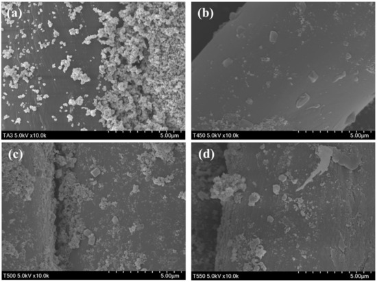 Morphologies of the prepared photocatalyst-treated PET fabrics; (a) aT, (b) 450TF, (c) 500 TF, and (d) 550 TF.