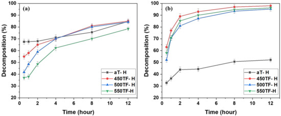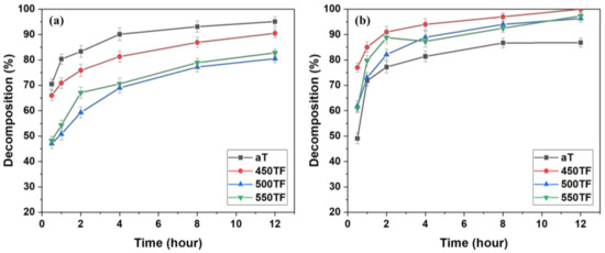 Figure 8 depicts the photocatalytic degradation of MB under UV or sunlight for fabrics aT-H, 450TF-H, 500TF-H, and 550TF-H. With UV irradiation, aT-H exhibited the highest level of MB decomposition by photocatalytic degradation after only 30 min; however 450TF-H and 500TF-H showed the similar decomposition to that of aT-H after 12 h. With sunlight irradiation, aT exhibited the lowest level of MB decomposition with only 52.2% decomposition, whereas 450TF, 500TF, and 550TF exhibited 98, 95.2, and 96.2% decomposition, respectively, after 12 h. Therefore, the photocatalytic self-cleaning properties of those samples were superior to the commercial anatase TiO2/HDS-treated samples, as shown in Section 3.2. This is quite impressive, because we expected that HDS would cover the surface of the photocatalyst on the fabric surface and significantly hinder photocatalytic degradation. However, the surface of the photocatalyst were not perfectly covered, allowing it to maintain its function.