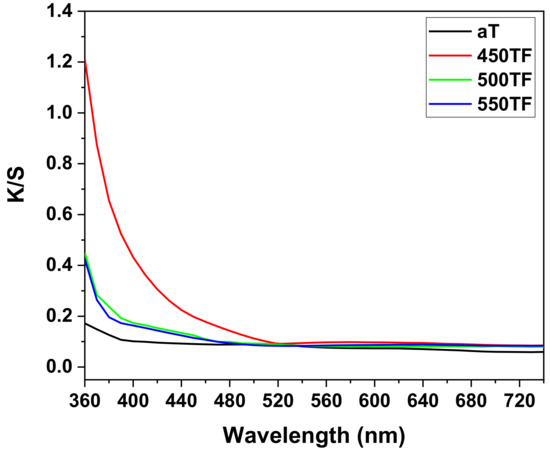 Figure 4 shows the photocatalytic degradation of MB under UV and sunlight for the PET fabrics aT, 450TF, 500TF, and 550TF. With UV irradiation, aT exhibited the highest MB decomposition by photocatalytic degradation even after 30 min, and 95.1% of the MB stained on this fabric was decomposed after 12 h. However, with sunlight irradiation, aT exhibited the lowest level of MB decomposition with 86.8% decomposition, whereas 450TF, 500TF, and 550TF exhibited 100, 96.3, and 97.3% decomposition, respectively, after 12 h. Therefore, the photocatalytic self-cleaning properties of those samples were superior to the commercial anatase TiO2 treated samples. This is because anatase TiO2 only utilizes UV light, whereas TiOF2 utilizes both UV and visible light for the photodegradation of MB [39,40,41]. As already mentioned, UV makes up only a small portion of sunlight. To confirm visible light absorption of the prepared samples, the K/S values of aT, 450TF, 500TF, and 550TF from 360 to 780 nm were measured using a spectrophotometer mentioned in Section 2.6. Figure 5 shows that 450TF yielded significantly higher K/S values from 360 to 780 nm than the other fabrics with aT yielding the lowest K/S values. When the color was whiter, the K/S values from 360 to 780 nm were close to 0, whereas these values are higher, when the color was blacker. In other words, higher K/S values from 360 to 780 nm mean greater absorption of visible light. Therefore, 450TF showed the highest level of photodegradation owing to visible light absorption and sensitization.